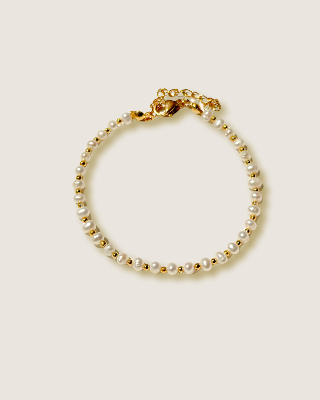 Delicate pearls meet polished gold in this dainty bracelet. Designed with smaller beads for a refined, everyday look — elegant on its own and perfect for layering.
