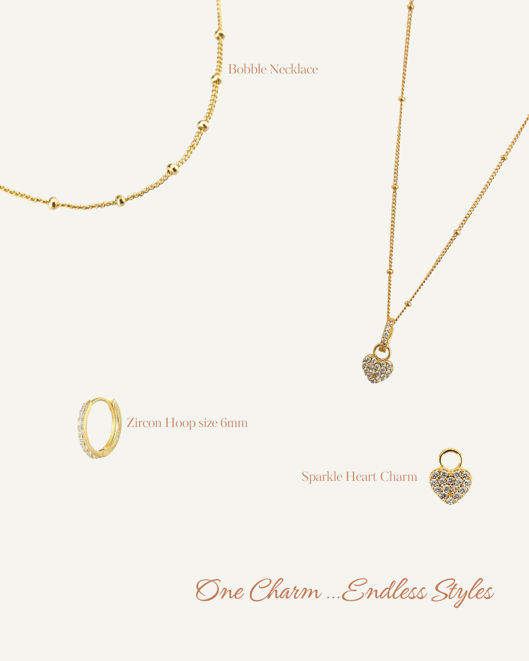 Two looks, one bundle. This set includes our Zircon Hoop in size 6mm and Bobble Necklace with our Sparkle Heart Charm that can be styled your way — wear the charm on the hoop as an earring, or slide it onto the necklace for a minimalist pendant look. A versatile duo made to mix, match, and shine.